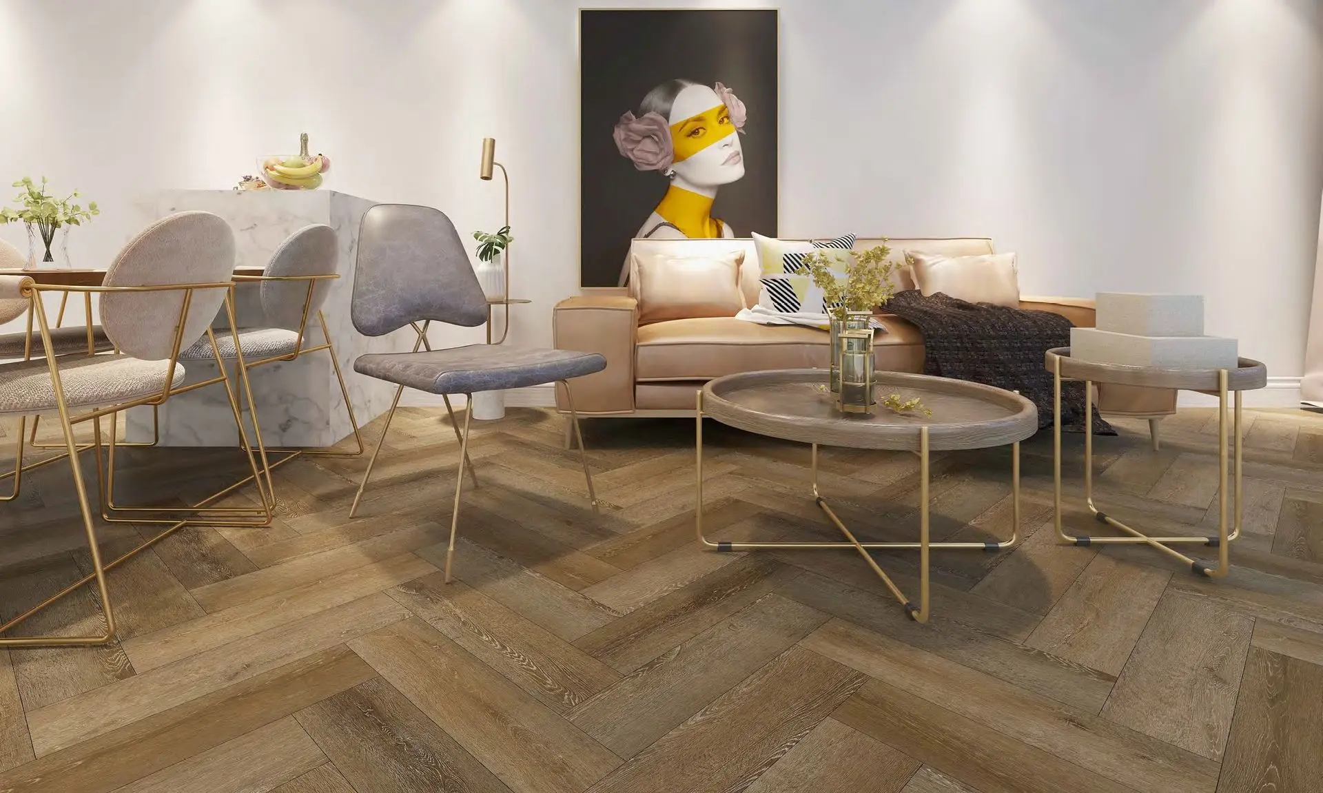 van een visgraatvloer, nu met de moderne voordelen van Click PVC. Een Click PVC visgraatvloer combineert de klassieke, luxueuze uitstraling van visgraat met de praktische eigenschappen van een innovatieve vloer. Geniet van een geluidsdempende en sterke vloer die bestand is tegen krassen en deuken. Dankzij de 100% waterbestendigheid is deze vloer perfect voor elke ruimte, zelfs voor de badkamer en keuken. De handige klikverbinding zorgt bovendien voor een eenvoudige en snelle plaatsing, waardoor je in een handomdraai een stijlvolle en duurzame basis creëert voor je interieur.