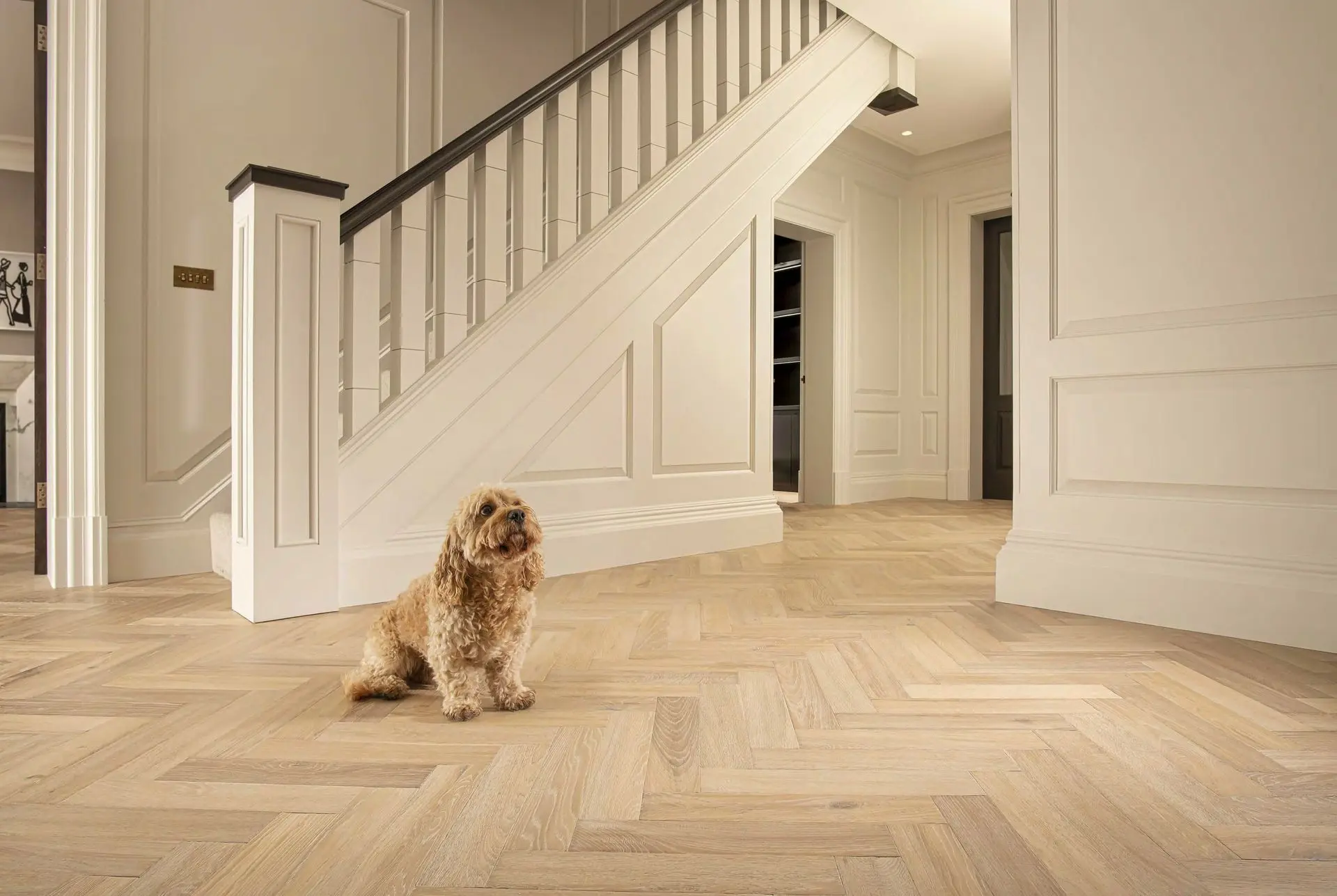 De reden dat visgraat zo'n luxe uitstraling heeft, is dat het historisch gezien te vinden was in herenhuizen, paleizen en chique appartementen. Het staat voor vakmanschap en detail, omdat de plaatsing van de korte, haaks op elkaar geplaatste planken een nauwkeurig proces is. Het resultaat is een vloer die niet alleen functioneel is, maar ook een kunstwerk op zich, een blikvanger die de basis vormt voor een stijlvol interieur.