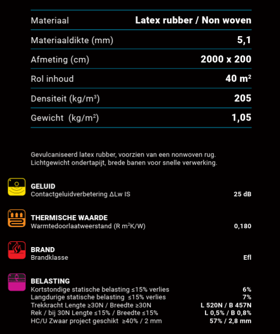 Flex-rubber ondertapijt 2.00x20m dikte 5.1mm (rol 40m²)